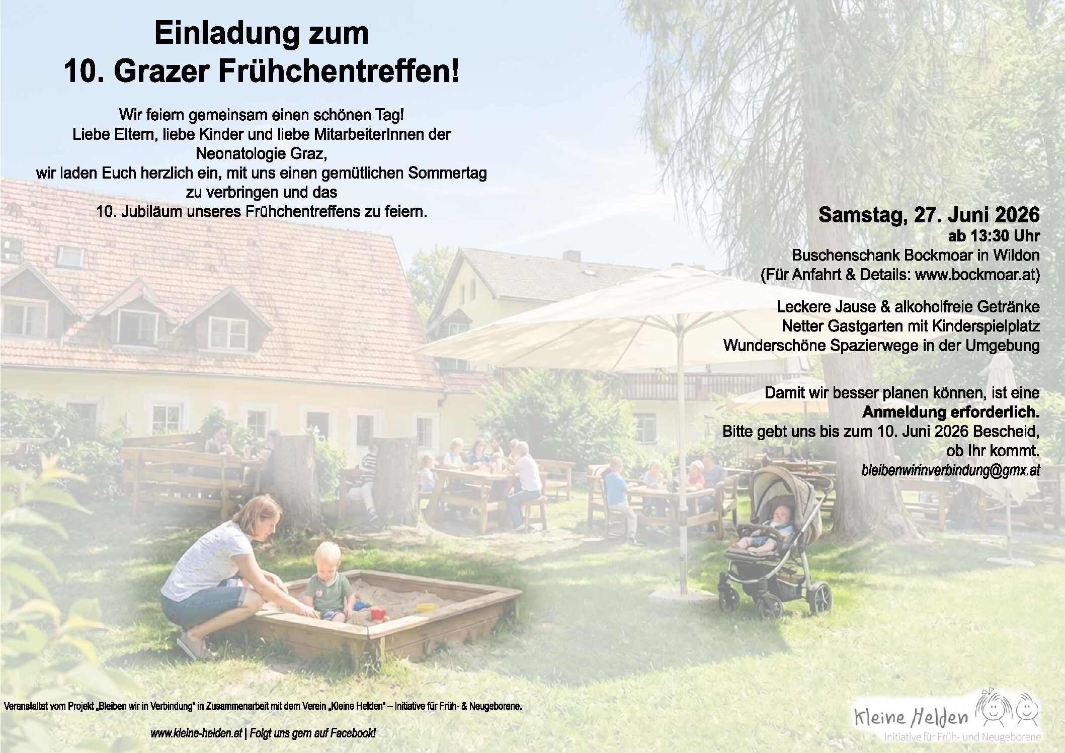 Da leider die Teilnehmerzahl auf 60 Erwachsene und circa 30 Kinder beschränkt ist, müssen wir um Vorabanmeldung bis zum 10.6.2026 unter bleibenwirinverbindung@gmx.at oder unter 0316 385 83830 bitten.